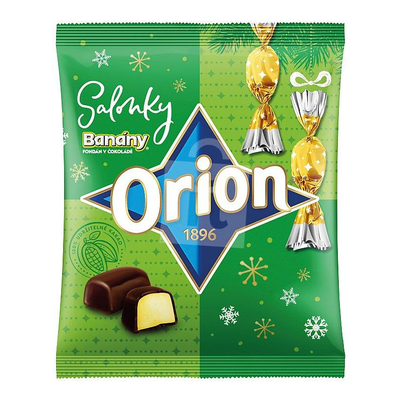 Banana-flavoured fondant sweets dipped in dark chocolate. Sweeten your Christmas with a delicious banana-flavoured dark chocolate. Fondant candy 75% with the taste of bananas in dark chocolate 25%. The package contains approximately 21 servings.