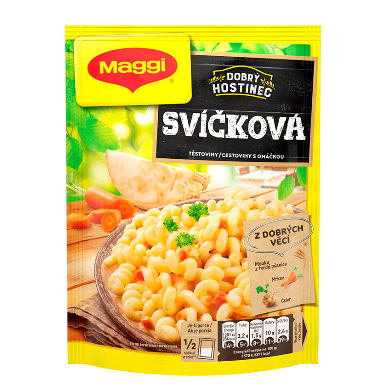 Pripravte si lahodné cestoviny s omáčkou inšpirované českou kuchyňou. V balení nájdete zmes sušenej mrkvy, cibule a zeleru, korenia a tymianu. Stačí vsypať do 0,5 l horúcej vody, zamiešať a variť do zhustnutia omáčky. Za 5 minút máte hotovo.