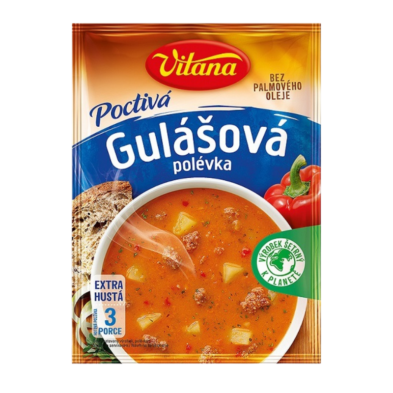 Zloženie suchej zmesi: zápražka (pšeničná múka, bravčový tuk), zelenina (zemiaky 16%, cibuľa 3%, cesnak, paprika 1%), hovädzie mäso 7%, škrob, opečená bravčová slanina, arómy, jedlá soľ, sójový hydrolyzát, ryžová múka, paprika mletá (sladká a čili paprička), zahusťovadlo xantánová guma, majorán 0,4%, vaječný bielok, zmes korenín a extrakty korenín, cukor, droždie, pšeničná vláknina, farbivo paprikový extrakt.