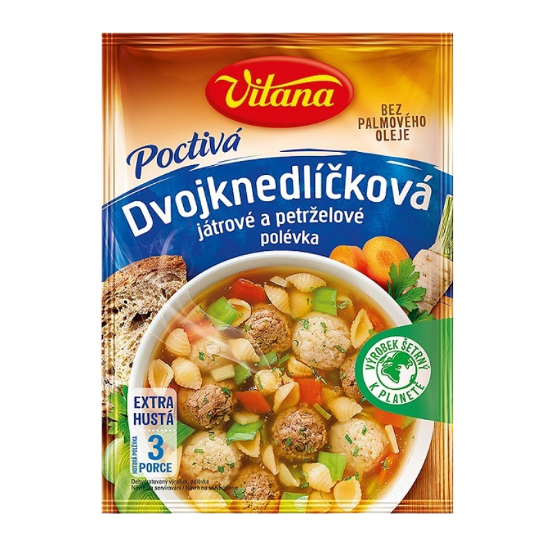Zloženie suchej zmesi: pečeňové knedličky 23% (pšeničná krupica a múka, bravčová pečeň 8%, hovädzie mäso, kokosový olej, sušené vajcia a vaječný bielok 8,4%, cesnak 5%, bravčová bielkovina, laktóza, kypriace látky: glukóno-delta-laktón a hydrogénuhličitan sodný, droždie, sójový hydrolyzát,ryžová mouka, jedlá soľ, zmes korenín, farbivo E150c, antioxidant rozmarínový extrakt, majorán), petržlenové knedličky 23% (pšeničná krupica a múka, kokosový a repkový olej, sušené vajcia a vaječný bielok 10 %, laktóza, jedlá soľ, petržlenová vňať 0,2 %, droždie, zmes korenín, semolinové cestoviny 17 %, sójový hydrolyzát, škrob maltodextrín, laktóza, kvasnicový výťažok, cibuľa, arómy, jedlá soľ, karotka 1,8%, pór 1,8%, petržlen koreň 0,2%, tavený slepačí tuk, farbivo riboflavín.