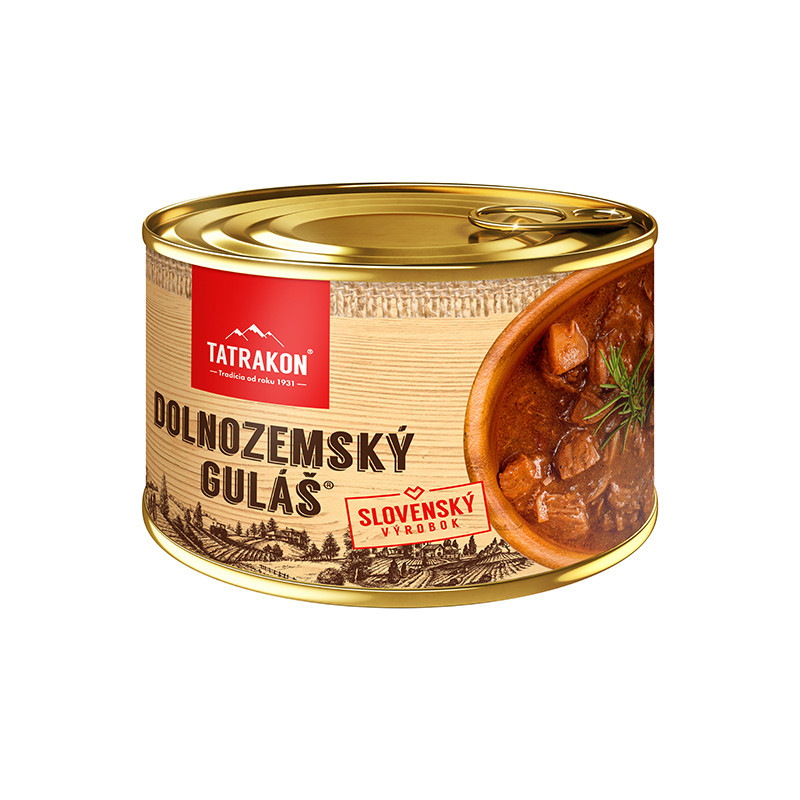 Dolnozemský guláš. Termosterilizované hotové jedlo. Minimálna trvanlivosť do dátumu uvedeného na obale. Výrobok je určený po ohriatí na konzumáciu, môže byť mierne pikantný. Skladujte v suchu. Chráňte pred mrazom, priamym slnečným žiarením a sálavým teplom. Po otvorení ihneď spotrebujte!
