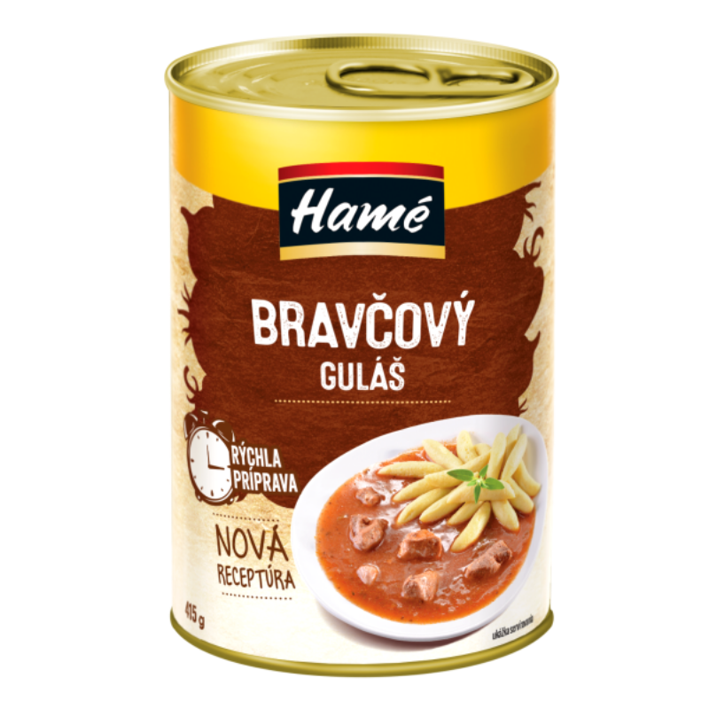 Zloženie: voda, bravčové mäso 24% hm., repkový olej, kukuričný modifikovaný škrob, paprika, cibuľa, paradajkový pretlak, koreniny, koreniaci prípravok (soľ, cukor, glukózový sirup, dextróza, kvasničný extrakt, škrob, sušená zelenina (cibuľa, mrkva, cesnak, petržlenová vňať), aróma (obsahuje ZELER), repkový olej, koreniny, extrakty korenín), zvýrazňovač chuti: glutaman sodný, cesnakový výťažok.