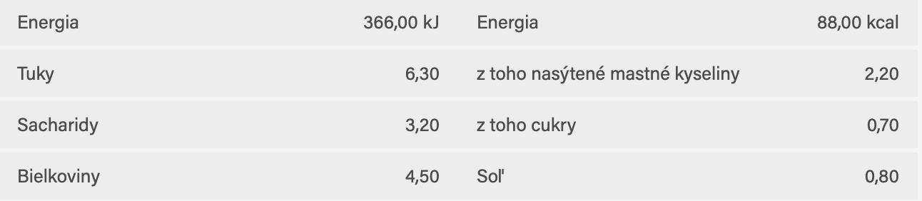 Priemerné výživové údaje na 100 g výrobku: