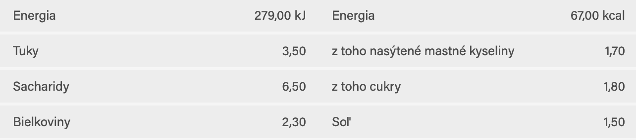 Zloženie: šampiňóny (41% hm.), voda, cibuľa, údená slanina (slanina, soľ, stabilizátor: dusitan sodný), pšeničná múka, smotana, repkový olej, paradajkový pretlak, pšeničný modifikovaný škrob, koreniny, sušené mlieko, koreniaci prípravok (soľ, úplne stužený palmový tuk, sojový hzdrolyzát, pšeničný škrob, mäsový extrakt, cukor, suš. hovädzie mäso (obsahuje laktózu), zelenina, zeler, extrakt korenín), petržlenová vňať.
