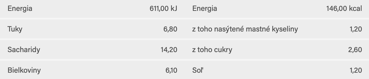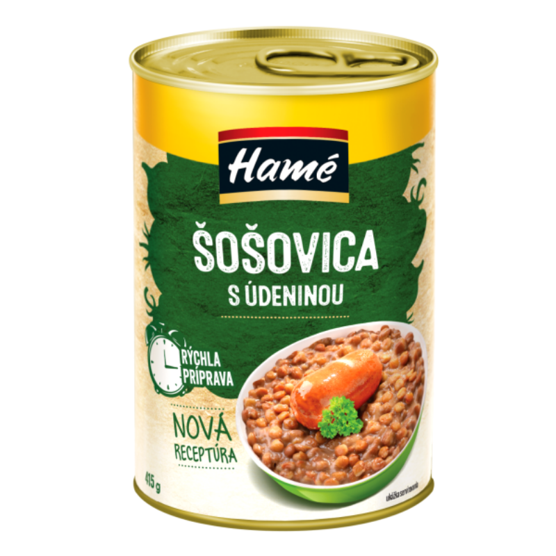 Zloženie: voda, šošovica 31% hm., údenina 12% hm. (mechanicky separované kuracie mäso 43% hm., bravčové mäso, voda, hovädzie mäso, soliaca zmes (soľ, stabilizátor: dusitan sodný), bravčový krvný proteín, bravčový proteínový extrakt, koreniaci prípravok (stabilizátory: difosforečnan, trifosforečnan, dextróza, koreniny, antioxidant: kyselina askorbová, antioxidant: erytorban sodný, emulgátory: mono – a diglyceridy mastných kyselín, extrakty korenín), koreniny), PŠENIČNÁ MÚKA, repkový olej, cukor, kvasný liehový ocot, soľ, sušená cibuľa, koncentrát z čierneho korenia.