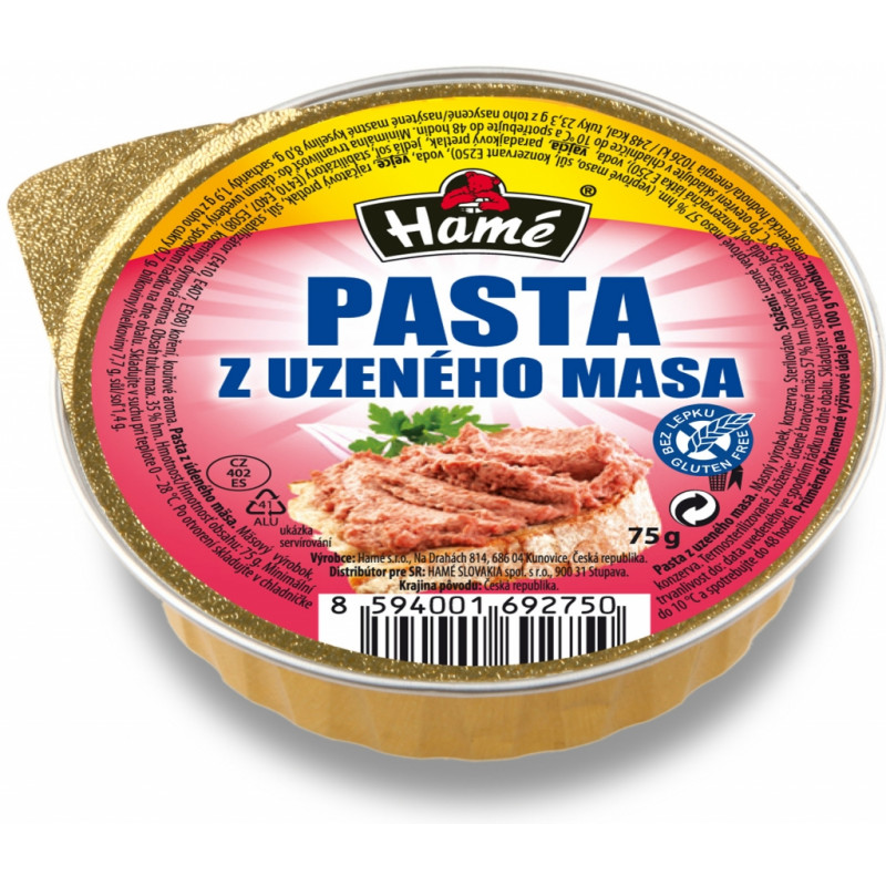 Zloženie: údené bravčové mäso 57 % hm. (bravčové mäso, soľ, konzervant E250), voda, vajcia, paradajkový pretlak, soľ, stabilizátor (E410, E407, E508), korenie, aróma (soľ, kvasničný extrakt, aróma (aromatická látka, prírodná aromatická látka, zahusťovadlo E414, rastlinný olej, sacharóza, maltodextrín, rozpúšťadlo E1518), aróma dymová (maltodextrín, prírodná dymová aróma, protispekavá látka E551).