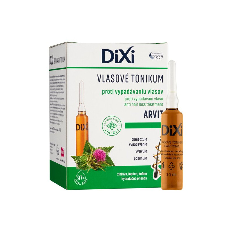 - Dixi Arvit vlasové tonikum proti vypadávániu vlasov 7 x 10 ml v ampulkách pomáha bojovať proti vypadávaniu vlasov vďaka rastlinným extraktom obohateným o provitamín B5 (D-Panthenol), hydratačnú zložku phytantriol, vitamín F a kofeín. Prípravok je určený na všetky typy vlasov, vhodný aj pre vlasy so sklonom k masteniu. Obsahuje 97% zložiek prírodného pôvodu.