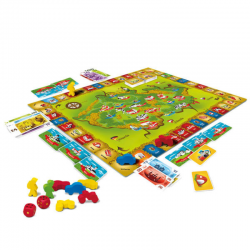 Balení obsahuje: 1 herní plán, 12 dřevěných figurek ve 4 barvách (4 pěší turisté, 4 motorky, 4 auta), 2 bodové hrací kostky, 104 bankovek, 48 karet hradů a zámků, 44 akčních karet, 1 návod