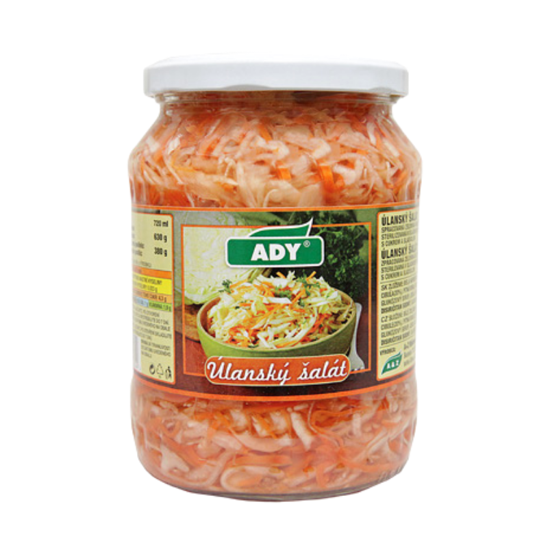 Zloženie: biela kapusta 60%, mrkva 20%, cibuľa 20%, pitná voda, kvasný liehový ocot, jedlá soľ, cukor, antioxidant-disiričtan sodný, sladidlo-sacharín