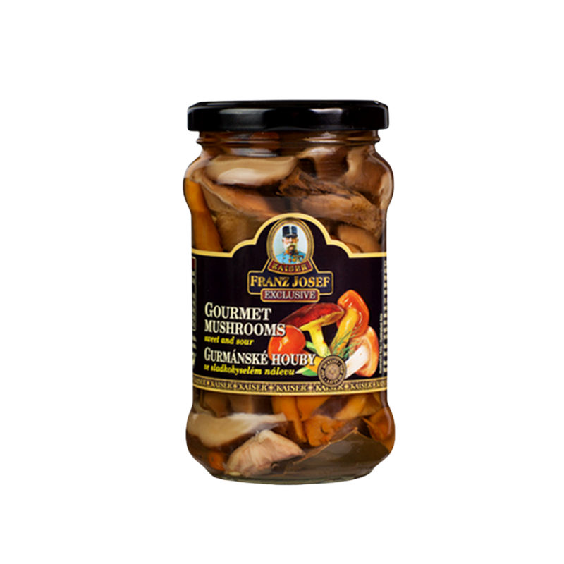 Gurmánske jedlé huby v korenenom sladkokyslom náleve. Pasterizovaný výrobok z jedlých húb
